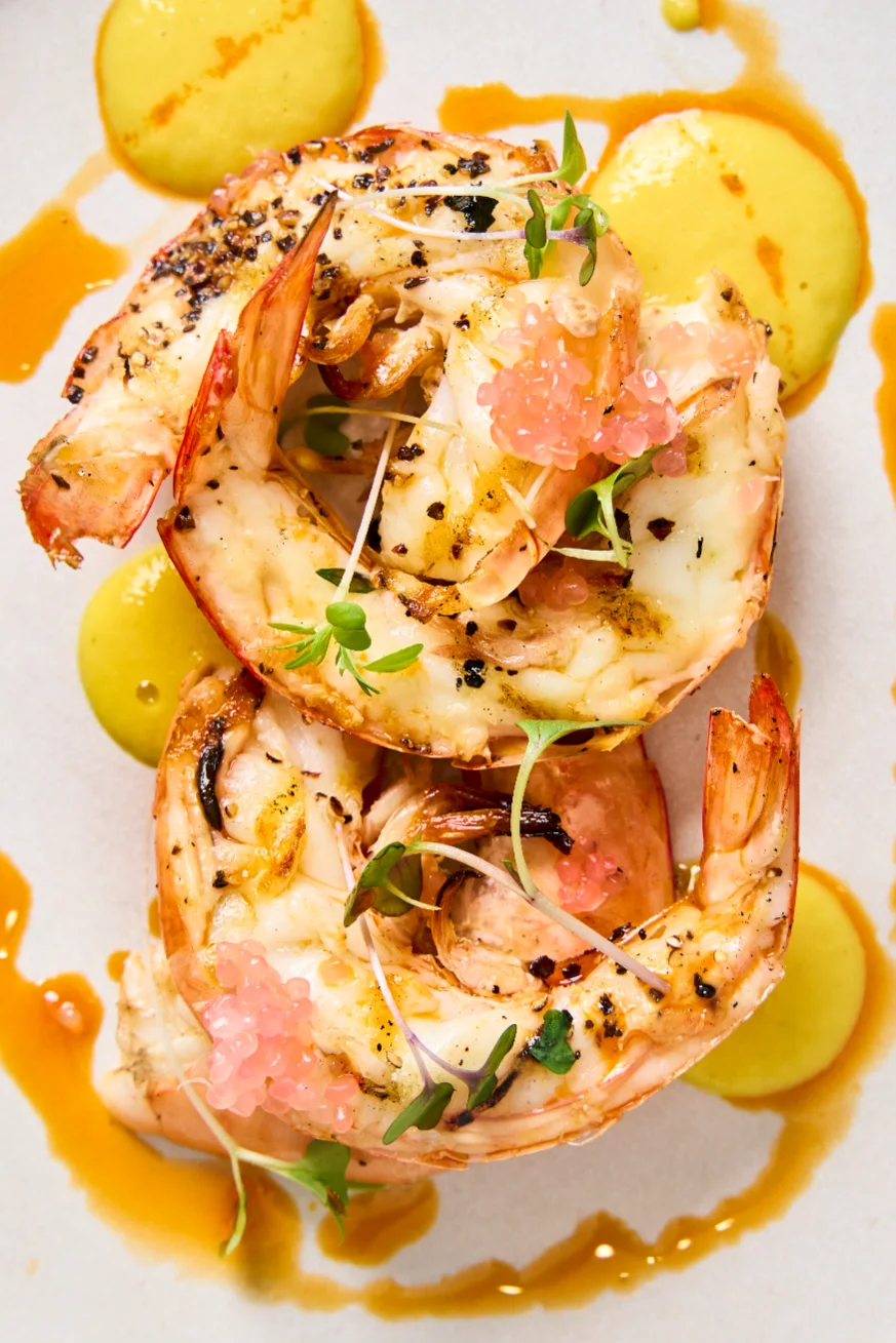 Chargrilled split prawns, saffron & sweet corn emulsion, chilli oil & charred lemon